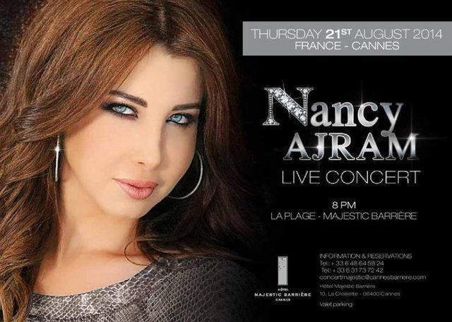 أعلنت النجمة اللبنانية نانسي عجرم على صفحتها الشخصية بموقع التواصل الاجتماعي فيسبوك عن إحيائها لحفل غنائى فى فرنسا وتحديدًا فى مدينة كان وذلك يوم 21 أغسطس القادم، ضمن جولة حفلات ألبومها الأخير.