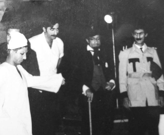 مشهد من مسرحية (المصيده) للمخرج القدير سامي عبد الحميد على مسرح نادي االصيد ببغداد في ستينات القرن الماضي وهذه الصورة النادرة التي بين من اليمين الفنان محمد عطا سعيد والفناان صلاح القصب والفنان الراحل طعمة التميمي (رحمه الله) والفنان شهاب االقصب .