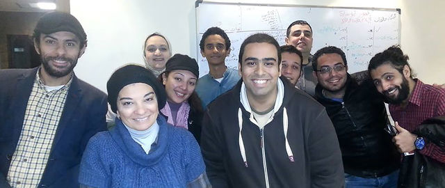 رئيس فريق الكتابة تامر عبد الحميد مع المخرجة تغريد العصفوري والمؤلفين أعضاء فريق الكتابة