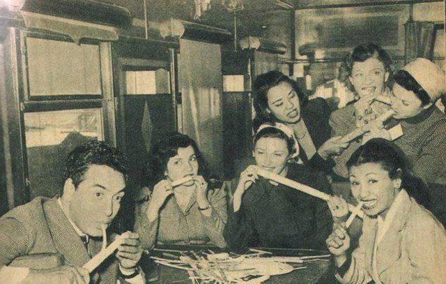 المونولوجيست الشهيرة ثريا حلمي مع عدد من زملائها في قطارات الرحمة التي نظّمها الفنانون لمحافظات الوجه القبلي والبحري؛ من أجل دعم القوات المسلحة، عقب نجاح ثورة 23 يوليو 1952
