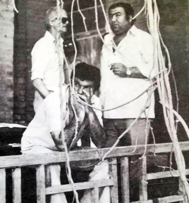 المخرج محمد شكري جميل و مساعده العراقي صبيح عبد الكريم و البريطاني روبرت لين بانتظار الممثلين الذين سيحضرون إلى باحة تصوير فلم (المسألة الكبرى) بعدسة جاسم الزبيدي ١٩٨١.
