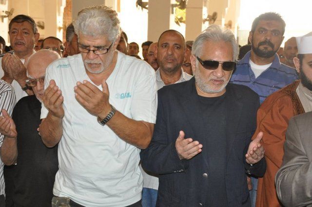 صورة تجمع الممثل سامح الصريطي وطارق النهري وبعض الحضور في عزاء الفنان الراحل "عمر الحريري".