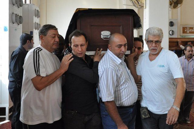 صورة تجمع الممثل طارق النهري وايمن الشيوي وبعض الحضور أثناء حملهم نعش الفنان الراحل "عمر الحريري".
