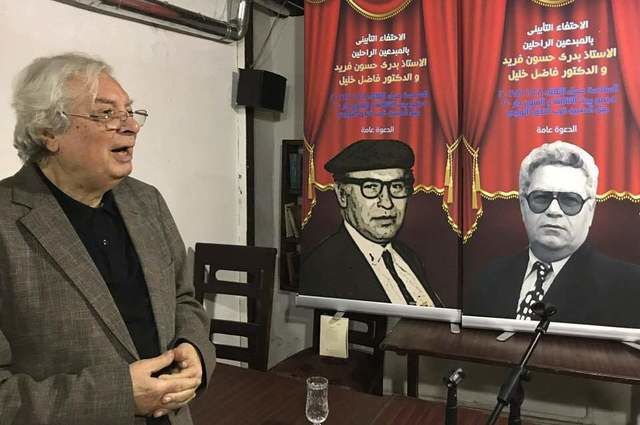 الفنان فيصل الياسري يلقي كلمة اثناء اقامة الحفل التأبيني للفنانين الراحلين فاضل خليل وبدري حسون فريد بالعاصمة الاردنية عمان عام 2017م .