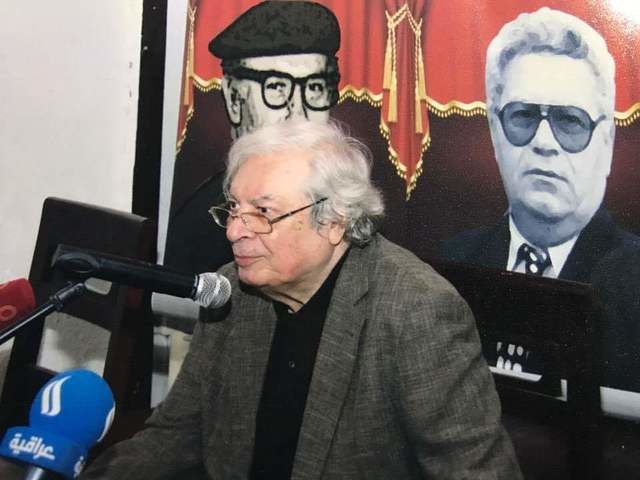 الفنان فيصل الياسري يلقي كلمة اثناء اقامة الحفل التأبيني للفنانين الراحلين فاضل خليل وبدري حسون فريد بالعاصمة الاردنية عمان عام 2017م .