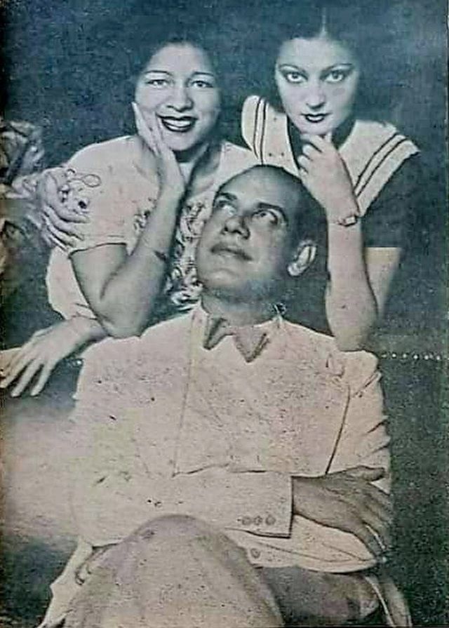 صورة نادرة للفنان سراج منير تعود لمطلع الأربعينيات، بصحبة الفنانتين زوزو حمدي الحكيم وروحية خالد.