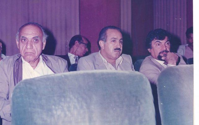 المخرج السينمائي الراحل صلاح أبو سيف والمخرج السينمائي العراقي محمد شكري جميل والفنان السينمائي العراقي القدير ضياء البياتي في صورة نادرة بالقاهرة عام 1984م .