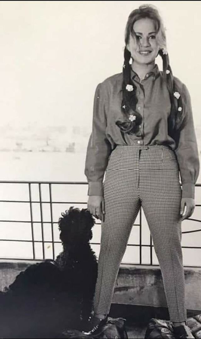 هند رستم بشرفة شقتها التي تطل على النيل بشارع المنتزة بحي الزمالك، نهاية الخمسينيات.