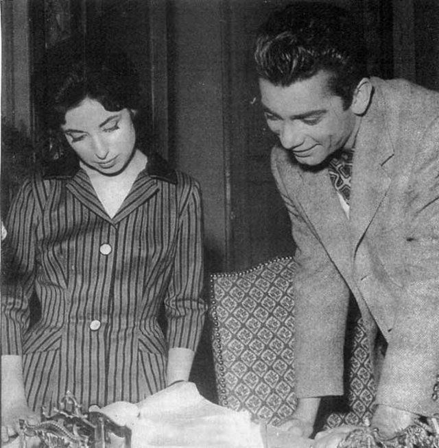 صالح سليم والنجمة نجاة الصغيرة اثناء مراجعتهما لسيناريو احد مشاهد الفيلم