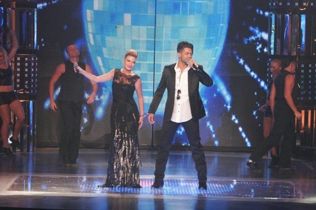 فادي أندراوس مع باميلا الكيك أثناء غنائهم معا.