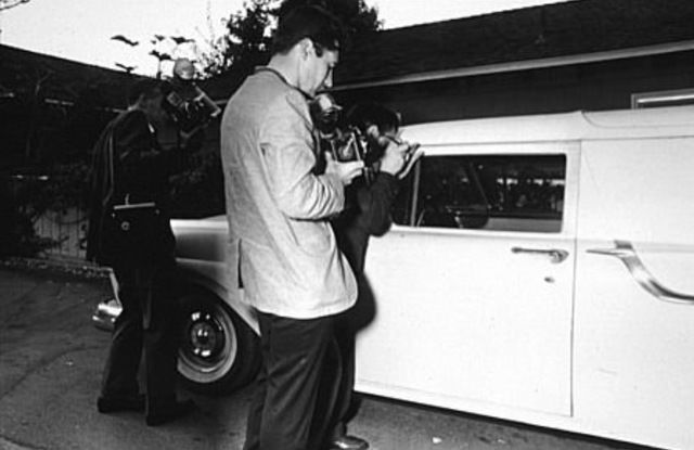 أحد المصورين يلتقط لصورة لسيارة الموتى التى تحمل جثمان مارلين مونرو.