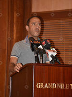 جانب من المؤتمر الصحفي الذي أقامه الفنان أشرف عبد الباقي على مسرح جراند حياة، للإعلان عن تفاصيل مشروعه المسرحي وتغيير اسمه من "تياترو مصر" إلى "مسرح مصر".