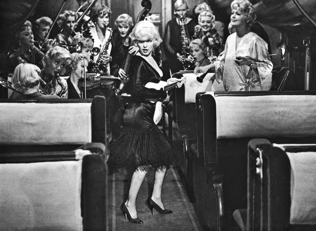 مارلين مونرو ترقص فى القطار فى مشهد من فيلم البعض يفضلونها ساخنة Some Like it Hot وتونى كيرتس و جاك ليمون يعزفون بينما وقفت جوان شاولى تراقب الموقف.