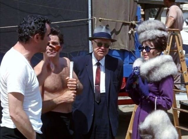 فى الكواليس ناتالى وود مدثرة بالطو من الفرو بينما وقف بيتر فالك عاريا وجاك ليمون بالفانلة.