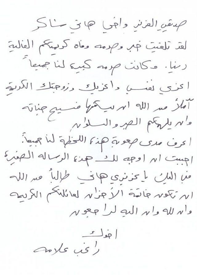 برقية تعزية ارسلها راغب علامة الى الفنان هانى شاكر لمؤاساته فى وفاة ابنته