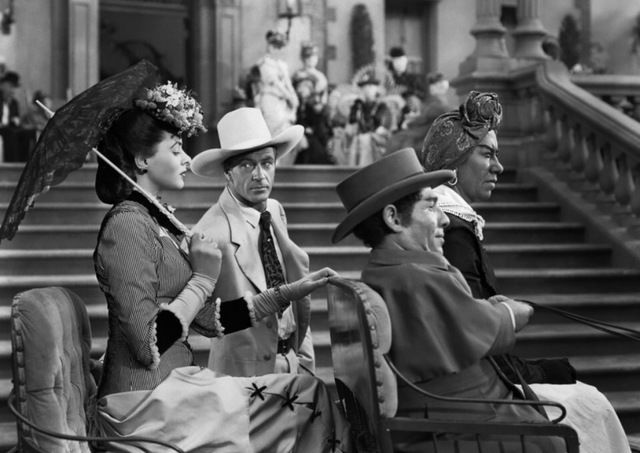 مشهد من فيلم Saratoga Trunk 1945 يجمع بين جارى كوبر و إنجريد بيرجمان ويقود الكاريته القزم جيرى اوستن وبجواره الخادمة فلورا روبسون.