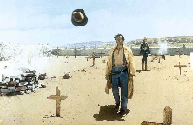 هنرى فوندا يطيح بقبعة تيرانس هيل، ليثبت قدرته على النيشان فى مشهد من الفيلم.