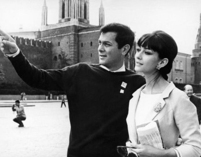 كرستين كوفمان مع زوجها تونى كيرتس يتحولان فى موسكو أثناء حضور مهرجان موسكو السينمائى ١٩٦٣.