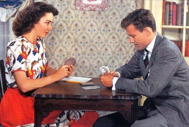 جينيفر جونز تلعب الورق مع زوجها روبرت ووكر فى المنزل.