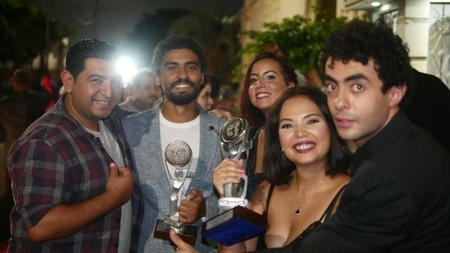 محمود يحيى ورغدة سعيد وأحمد أبو زيد وماهي سلامة مع الجوائز التي حصل عليها فيلم اختيار مريم في مهرجان الإسكندرية السينمائي الدولي 2023.