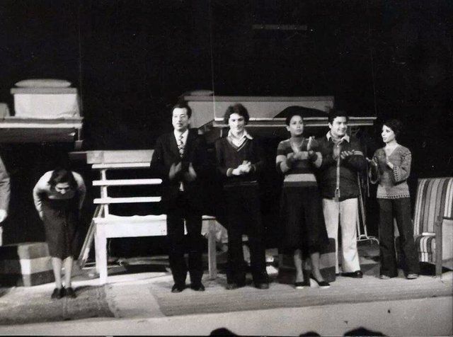 اثناء التحية بعد انتهاء عرض مسرحية (أضواء على حياة يومية) والتي اخرجها الراحل قاسم محمد ، في سبعينات القرن الماضي .
