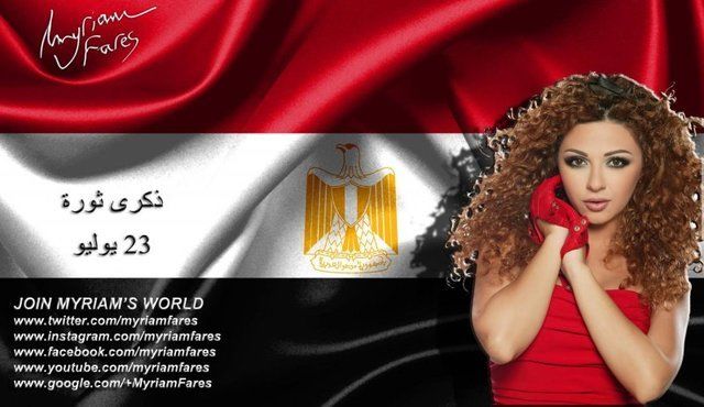 Lebanese star Miriyam Faris took to social media to extend a celebratory message to Egypt and her Egyptian fans on the anniversary of the July 23 revolution, a national holiday in Egypt. On her official Facebook page, she posted a photo of herself in front of an Egyptian flag with the message "in memory of the July 23 revolution."