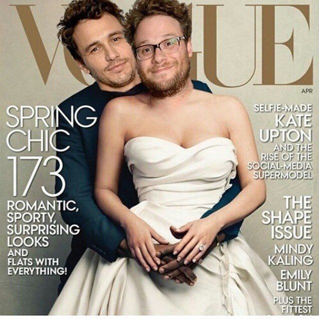 James Franco and Seth Rogen followed up their spoof of Kanye West's music video “Bound 2” last November, with a photoshopped version of the Vogue cover with their faces instead of Kim and Kanye's. Franco the groom, Rogen the bride.