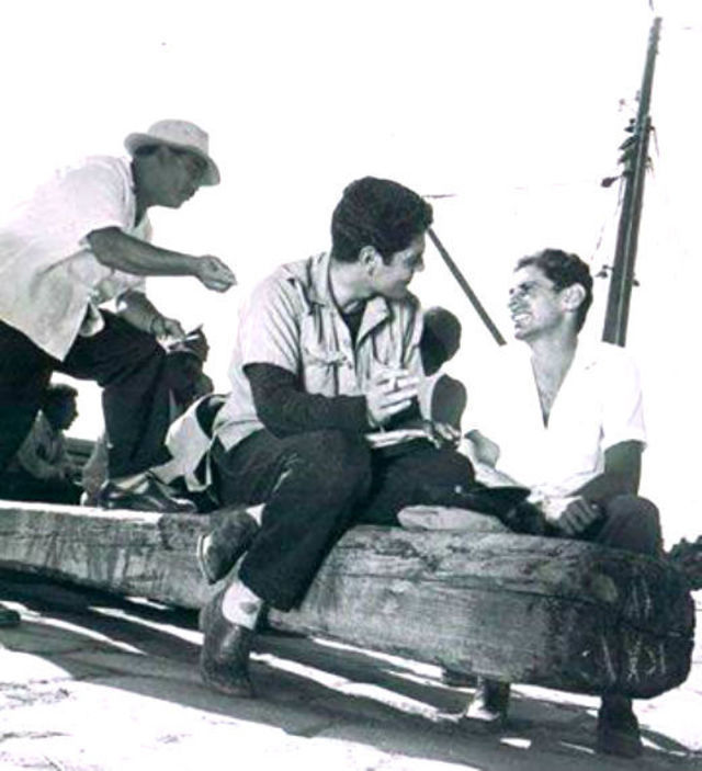 عمر الشريف ويوسف شاهين فى كواليس فيلم صراع فى المينا عام ١٩٥٦