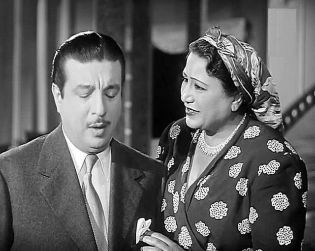 الفنانة القديرة فردوس محمد فى مشهد من فيلم "قلوب الناس" يجمعها بالبطل أنور وجدى.