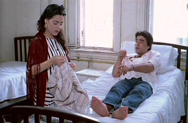 مشهد من فيلم المرشد يجمع بين شريهان ومحمود الجندي على سرير بأحد المستشفيات