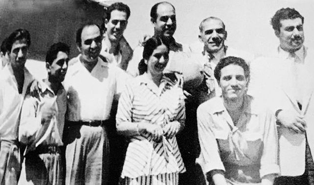 الفنان سراج منير والمخرج صلاح ابو سيف ومهندس الصوت عبدالخالق السامرائي والمطربة نظيمة ابراهيم في زيارة الى الاستوديو ، اثناء تصوير فيلم (عليا وعصام) عام 1948م .