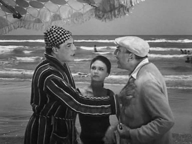 مشهد من الفيلم يجمع بين عمالقة الشاشة المصرية على شاطئ البحر .