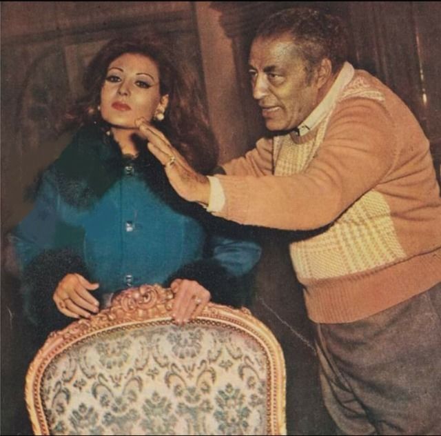 توجيهات المُخرج حسن الإمام للفنانة عفاف شعيب قبل تصوير أحد مشاهد فيلم (القضية المشهورة)، عام 1978.