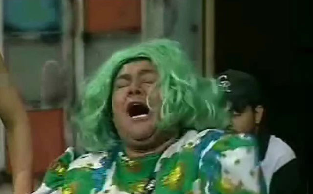 الفنان محمد الشرقاوى فى لقطة من المسرحية الكوميدية قصة الحي الغربى يرتدى فيها باروكة نسائية