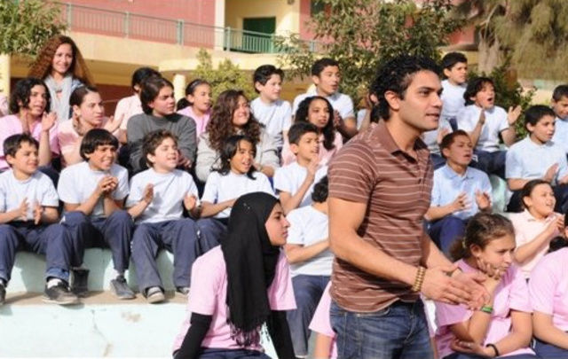 اسر ياسين ومنه شلبى فى لقطة من الفيلم وسط مجموعة من اﻷطفال يتابعون ماتش كرة سلة