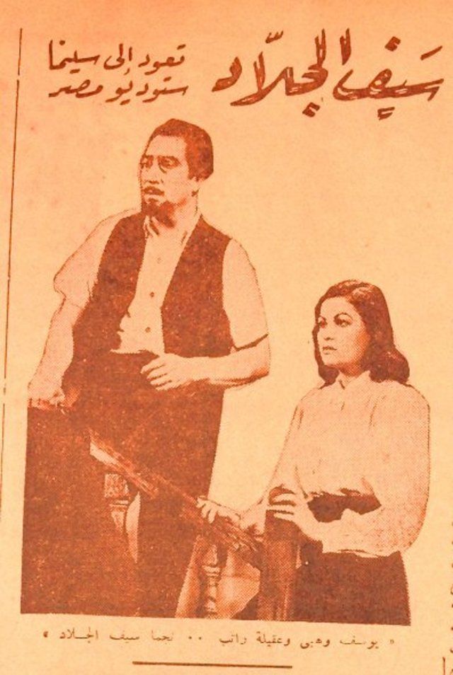 إعلان دعائي لفيلم سيف الجلاد ، مأخوذ من إحدى اعداد جريدة اخبار اليوم لعام 1945م
