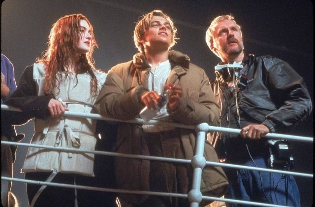 كيت و ليوناردو مع المخرج جيمس كاميرون فوق سطح السفينة يضبطون أحد المشاهد.