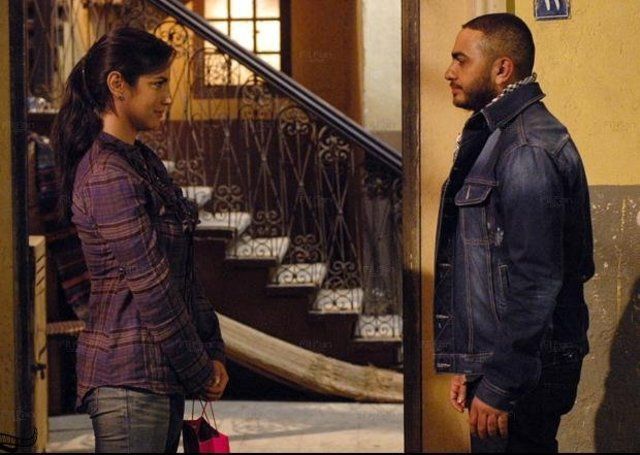 الفنانة التونسية درة تؤدى أحد مشاهدها أمام الفنان تامر حسنى بمسلسل آدم