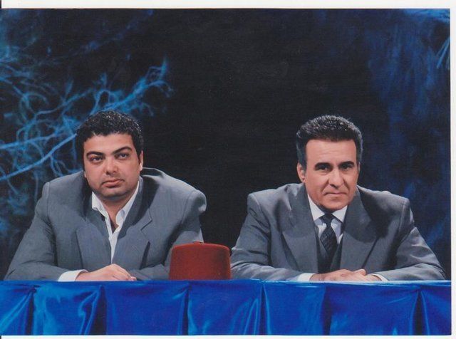 الفنان طارق الدسوقى والفنان أحمد منير فى لقطة من مسلسل "الرجل والطريق" فى عام 2009.