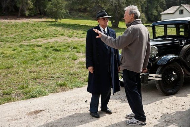 صورة للمخرج كلينت ايستوود وهو يوجه ليوناردو دي كابريو في كواليس فيلم جي إدجار.
