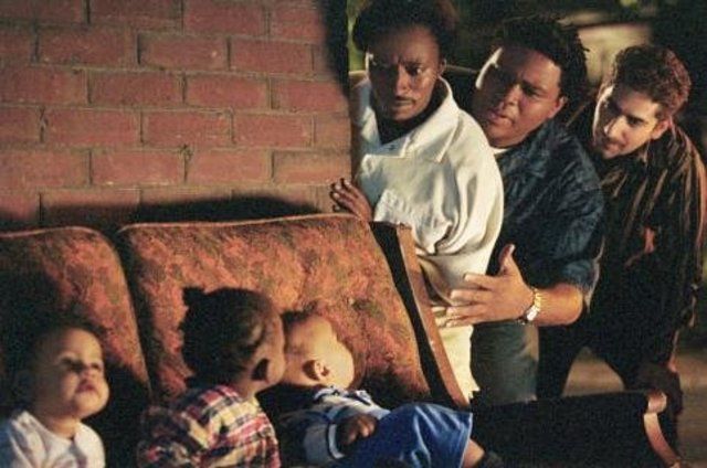 الابطال الثلاثة لفيلم "My Baby's Daddy"، إدي جريفين، أنطونى أندرسون، و مايكل أمباريولي، فى لقطة تجمعهم بأبناءهم الثلاثة بالفيلم.