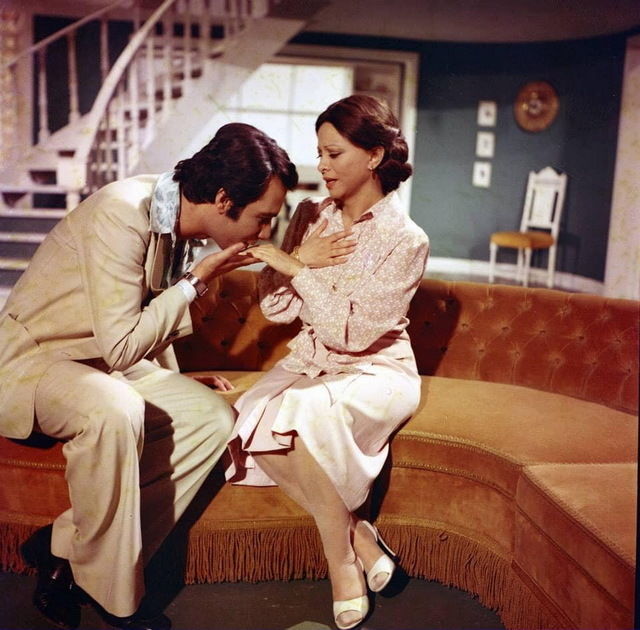 فوتوغرافيا بعدسة المصور القدير محمد بكر، النجمان فاتن حمامة ومحمود ياسين، فيلم أفواه وأرانب، 1977 م.