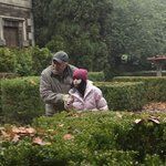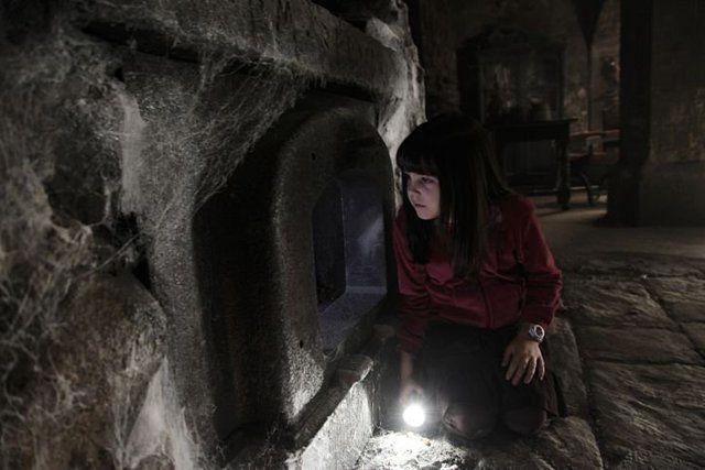 صورة لبالي ماديسون وهي تجلس على ركبتيهابأحد القصور القديمة