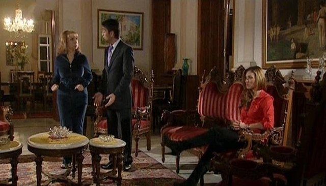 مشهد من المسلسل السورى "أخر خبر" تظهر فيه الفنانة مارسيل مارينا مع الفنان وسام صباغ.
