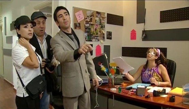 لقطة من مسلسل "أخر خبر" تجمع وسام صباغ، ماجى أبو غصن، و محمد خير الجراح.