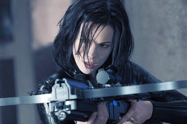 صورة للممثلة كيت بيكنسيل بفيلم (أندرجرواند) وهي تصوب بندقيتها نحو الأمام.