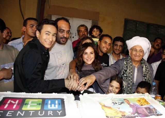 صورة تجمع بين كلا من حمادة هلال وأحمد حلاوة وشيرين عادل وأكرم فريد وباقي أبطال الفيلم في الاحتفال بقرب الانتهاء من تصوير فيلم أمن دولت.