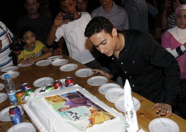 صورة لحمادة هلال وباقي أبطال الفيلم في الاحتفال بقرب الانتهاء من تصوير فيلم أمن دولت.
