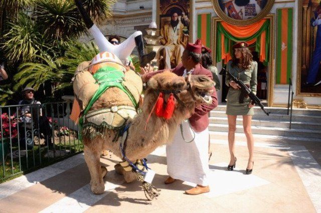 جولة لبطل فيلم الديكتاتور ساشا بارون كوهين بصحبة جمل في شوارع باريس بالزي الرسمي لشخصة فيلم الديكتاتور (الجنرال)