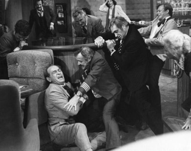 جاك ليمون ينقذ أحد الركاب بعد ان سقطت فوقه المائدة.